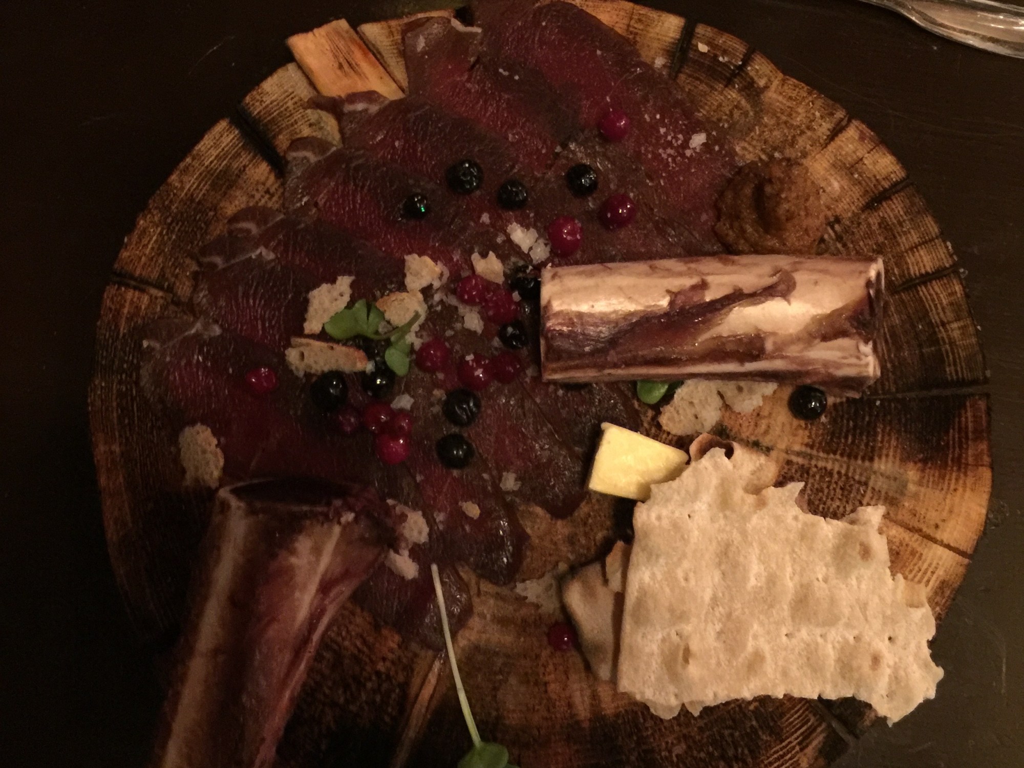 Maten bestod rakt igenom av viltkött, vad annars är lämpligt när man befinner sig inom samebyn Udtjá? Förrättsplankan av lite märgben och en slags carpaccio och märgben på älgkött om jag minns rätt. Varmrätten av en fantastisk renfilé och en hemgjord renkorv tillsammans med mandelpotatis, lite fläsk och lingon.